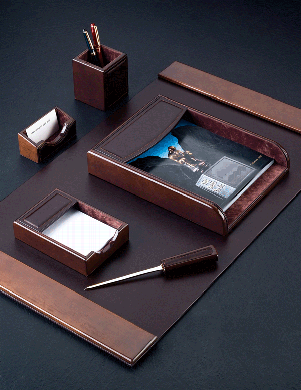Wood and Brown Leather Six-Piece Desk Pad Blotter Set